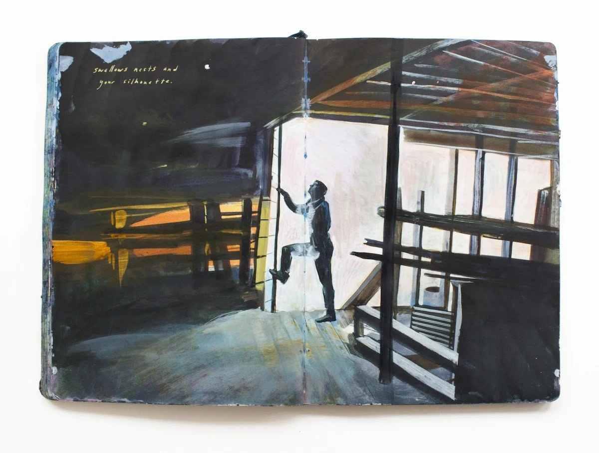 MD: That painting is about leaving Paris after a break-up. Even though it’s sad, it’s still a beautiful scene no matter how it was coloured by events. The original version in the book has a handwritten poem on it that reads, ‘An abrupt ending. I feel fractured. I fold my clothes’. I decided to exclude that poem from the large version because without it, the tone is ambiguous. Are you leaving or arriving, is this a melancholy scene or an exciting one? Gallery visitors tend to think it is a moment of arrival. The words would have pinned a negative feeling and might exclude some people from experiencing it as they want. I’ve noticed that most people use art as a way to imagine themselves into the picture. Which is fine with me. I wouldn’t put my artwork into the world otherwise.